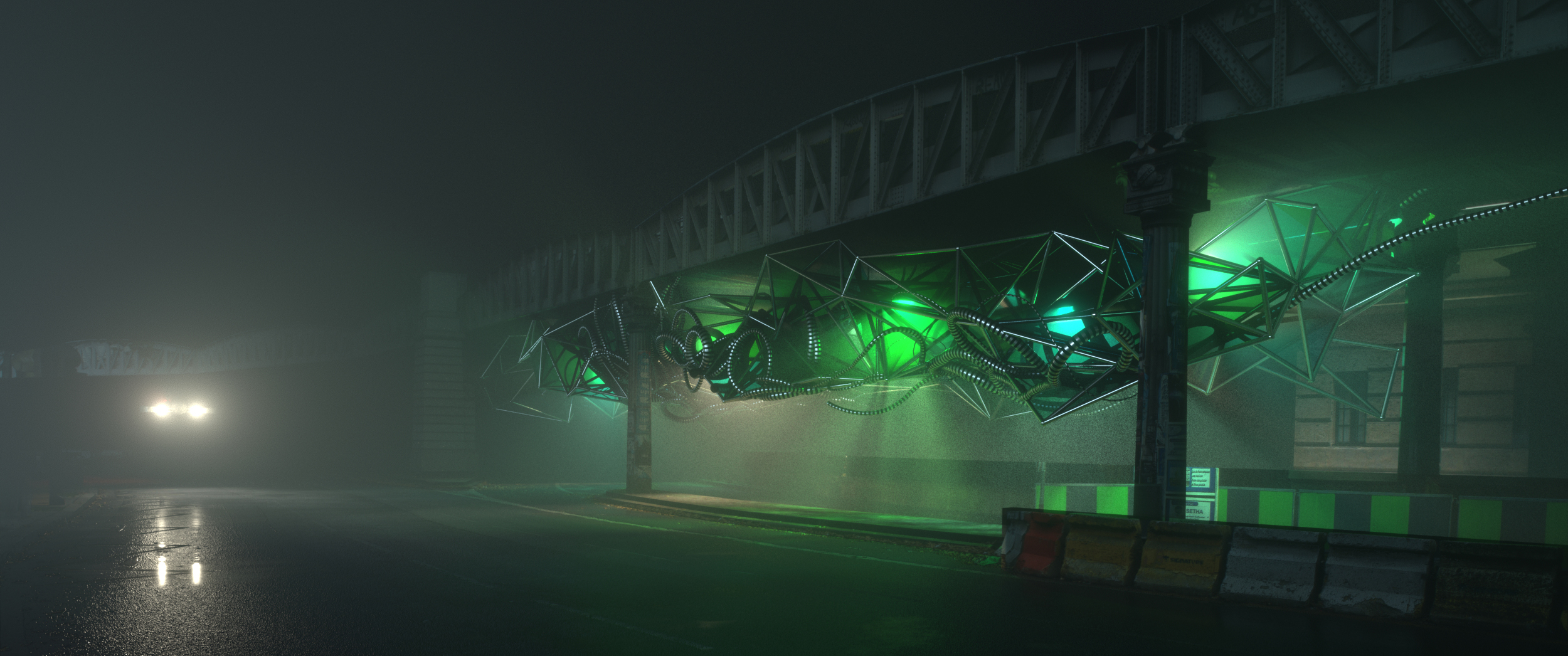 Exotopia is an installation made of concrete, earth, metal, colored liquid, colored vapors, car wrecks and robots. After years of drought, the ground cracked. Strange metallic plants grew. A new landscape appeared.