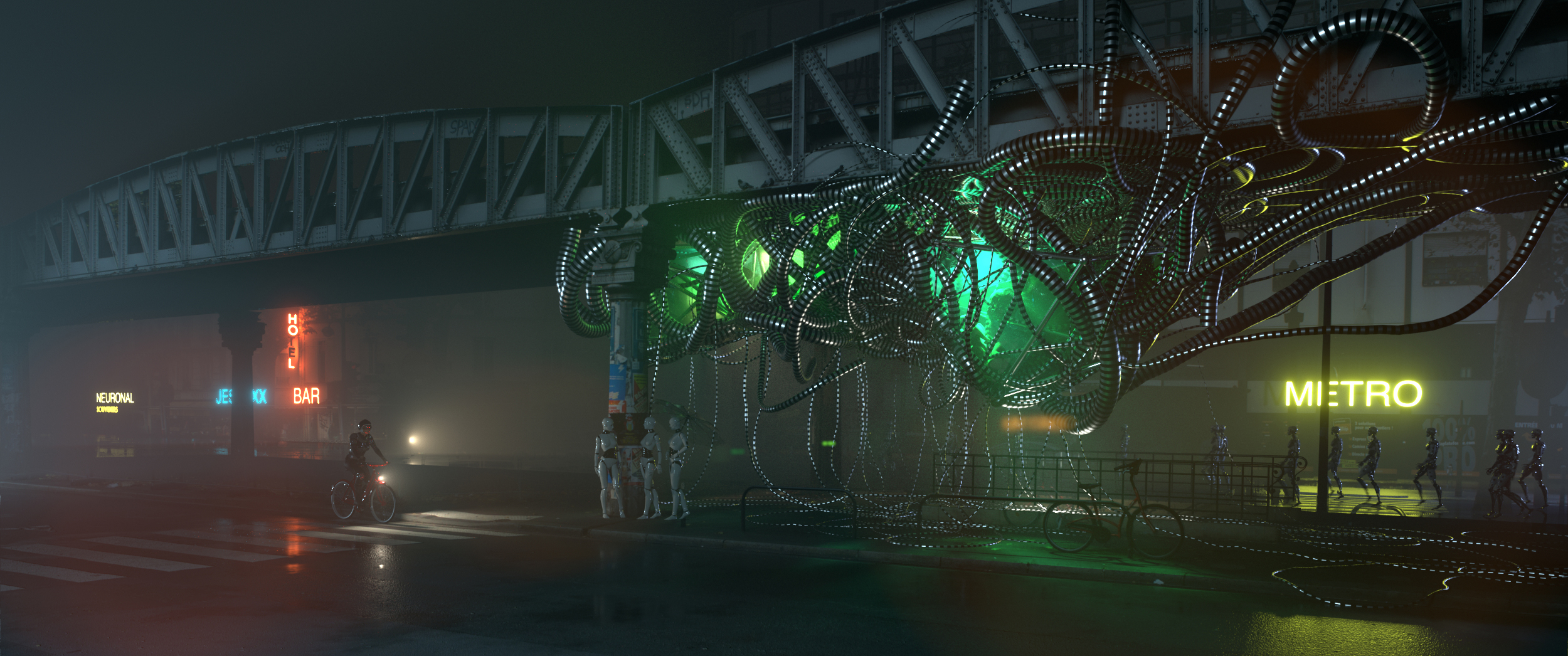 Paris, after long years of drought, the city’s asphalt was melting in places. At the Jardin des Plantes, the ground of the Evolution Gallery’s forecourt cracked. Emerging from the depths of the Earth, an opaque liquid irrigated this new landscape. Strange metallic plants grew, nourished by these toxic fluids. Among them, familiar silhouettes were exhumed. But these weren’t dinosaur skeletons or those of another extinct species — they were automobile carcasses rising from this dusty ground. As if the Earth was regurgitating its excess. It was fabricating a completely exotic new ecosystem, seeded from elsewhere and also, and above all — as if in vengeance — completely uninhabitable for any human being.